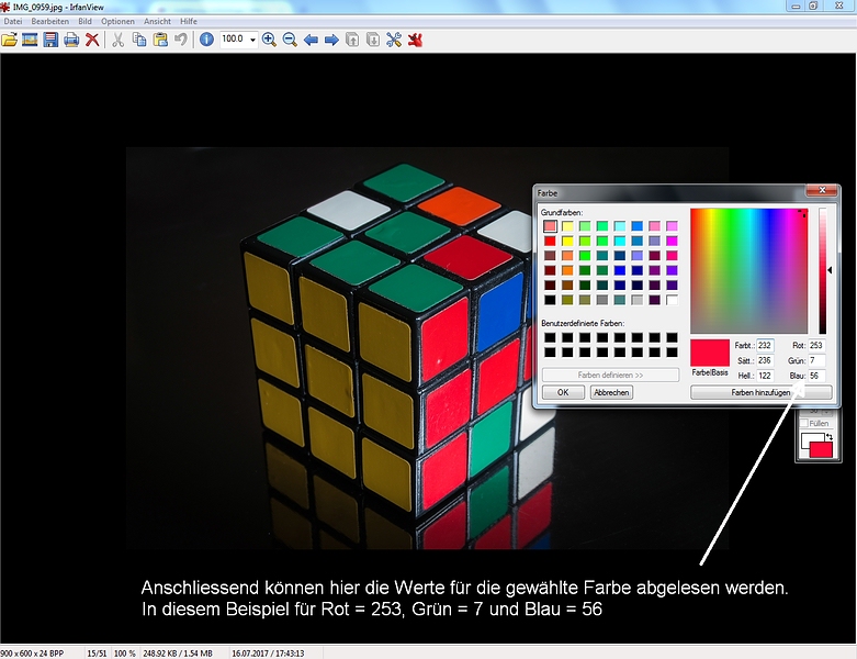 Die Farbwerte aus einem Foto kannst Du am einfachsten mit IrfanView bestimmen.