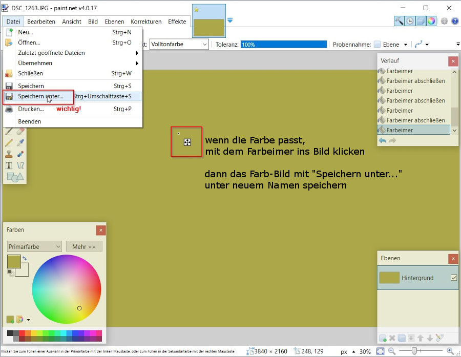 jetzt habe ich mir paint.net mal angeschaut. Ein nettes kleines Programm. Ich habe grad mal eine Anleitung gebastelt - und hoffe, dass du auch diese aktuelle Version auf dem PC hast und was damit anfangen kannst. Wenn ich eine genau passende Farbe für eine Farb-Datei haben will, öffne ich mir mein Quell-Foto in der Bildbearbeitung, picke mir eine passende Farbe aus und fülle mein komplettes Foto damit. Dann speichere ich mir diese Farb-Datei unter neuem Namen ab. Falls das Ursprungsbild zu klein ist, kann man das Farb-Bild dort auch gleich etwas größer skalieren. Mit 3000x3000px kommt man in der Regel gut hin, ohne dass ein störendes Warndreieck in der CEWE Software erscheint (das ist bei einfarbigen Bildern nicht relevant, kann aber bei der Gestaltung nerven). Du öffnest also dein Foto in paint.net. Dann klickst du an eine Stelle, von der du deine Farbe aufnehmen willst. In dem kleinen Rechteck links unten siehst du die gewählte Farbe. Bei Fotos mit vielen Farbabstufungen überprüfe ich gerne, ob die gewählte Farbe wirklich harmoniert. Dafür ziehe ich mir mit dem Auswahlwerkzeug irgendwo im Foto eine Auswahl auf. (Diesen Schritt kann man überspringen.) Dann wählst du den Farbeimer, stellst den Füllungsmodus auf global und die Toleranz auf 100%. Dann klickst du in den Auswahlbereich. Anschließend hebst du die Auswahl aus, indem du im Arbeitsbereich auf eine Stelle außerhalb des Bildes klickst. (Wenn du keine Probe machen willst, geht's mit dem nächsten Schritt weiter.) Ist die Farbe okay, klickst du (mit den vorherigen Einstellungen) ins Bild und hast ein einfarbiges Farbbild. Das speicherst du unter neuem Namen ab. Bei dieser Methode muss man wirklich aufpassen, dass man sich nicht das Originalfoto überspeichert! (Es gibt aber eine Alternative, siehe unten) Alternativ zum Speichern kannst du dein Farb-Bild kopieren und gleich ins Fotobuch einfügen. Dafür wählst du unter Bearbeiten "Alles auswählen" und "Kopieren" (oder drückst die Tastenkombis Strg+A und Strg+C). Dann wechselst du zum Fotobuch und wählst "Einfügen" (oder Strg+V). Es ist zwar jetzt viel Text, aber ganz einfach umzusetzen. Viel Erfolg liebe Grüße