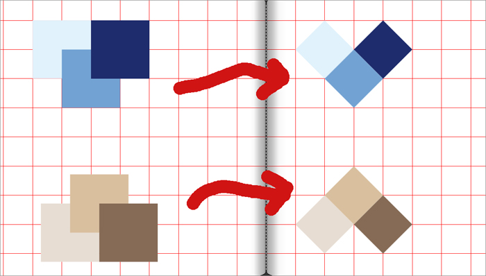 Das Prinzip meines Vorgehens ist, dass ich die Bilder ausrichte bevor ich sie mit der Eckendekoration zu Rhomben mache. Dazu muss ich auf halbe Bildabstände ausrichten, was ich mit dem Setzen eines entsprechenden Gitterabstands erreiche. Erst im letzten Schritt wende ich die Eckendekoration an. Im Detail: