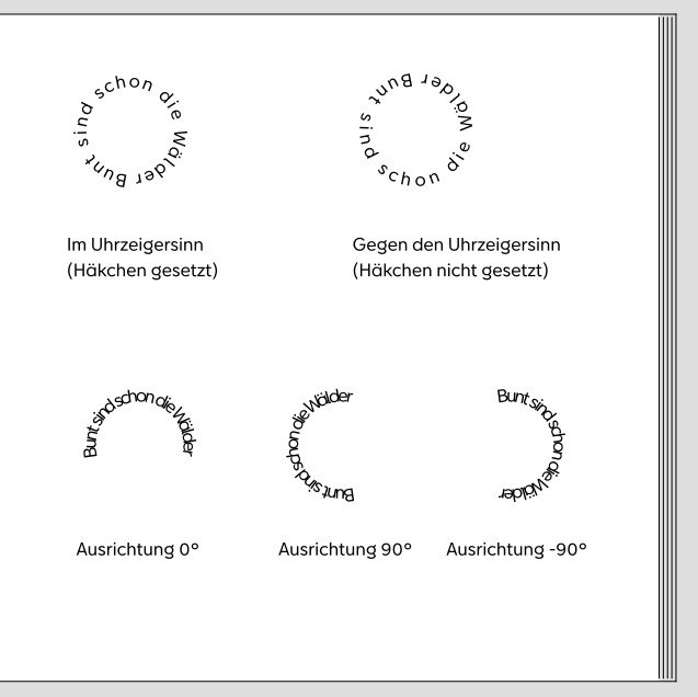 Für einen kreisrunden Text muss Dein Textfeld ein quadratisches Maß haben. Für alle anderen Textformen kannst Du individuell an den Seiten herumziehen und -schieben, wie schon von Heidi genannt. Wenn die Buchstaben einander zu sehr auf der Pelle hocken, hilft es, den Zeichenabstand soweit zu erhöhen, bis es gefällt. Den Textlauf kannst Du per aktiviertem Häkchen im Uhrzeigensinn oder entgegen des Uhrzeigersinns festlegen. Den Start des Textes kannst Du per Eingabe der Gradzahl oder per Nutzung des Schiebereglers darunter festlegen. Alternativ kannst Du Dein Textfeld auch an seinem Drehanfasser drehen. Insgesamt finde ich die Funktion sehr intuitiv. Spiel einfach mal mit allem herum, dann hast Du es schnell raus. Ein paar erste Gestaltungsideen haben wir in diesem Thread gezeigt. Liebe Grüße