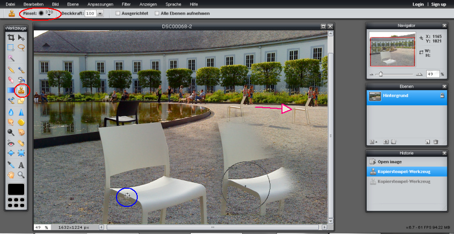 Genau :) Aber mit Geduld und Ausprobieren lässt sich sicherlich einiges zustande bringen! Ich hab offensichtlich sonst nichts zu tun Er hat ein Klonwerkzeug, das heißt Kopierstempel-Werkzeug und funktioniert recht gut. Kennst du dich denn mit Bildbearbeitungsprogrammen aus? Falls nicht, hier eine Kurzanleitung: Die Werkzeuge, die du brauchst, sind der Kopierstempel und die Pinseleinstellungen (rot umrandet). (Die Pinseleinstellung hat leider keinen OK-Button o.ä., man muss einfach irgendwo in den leeren Raum neben dem Bild klicken, um sie wieder zu schließen). Zum Klonen klickst du zuerst mit gedrückter Strg-Taste auf eine geeignete (Haut)Stelle, die du kopieren/klonen willst. Im Unterschied zu paint bewegt sich dann aber beim "Malen" auch der Referenzpunkt und der Pinsel malt immer genau den Bereich nach, in dem sich der Referenzpunkt (blauer Kreis) befindet. Das wichtigste aber: es wird nicht eine Farbe, sondern eine Struktur aufgenommen und wiedergegeben. Das heißt, wenn beim Malen der Referenzpunkt über den nächsten Pickel kommt, wird der auch geklont :lol: Und man muss besonders darauf achten, dass die Farbe und Helligkeit der beiden Stellen zueinander passt. Man kann auch versuchen, anstatt mit malen nur mit einem oder mehreren Klicks auf den Pickel zu klonen. Versuch mach kluch. Bei meinem Test hab ich zuerst oben die 2 Personen und den kleinen Stuhl kopiert (rosa Pfeil) und dann angefangen, den großen Stuhl zu kopieren. Mit richtig großem Pinsel, damit man auf dem Screenshot was sieht. Du müsstest natürlich viel feiner arbeiten. Anschließend dein Bild speichern und dabei die Qualität auf 95-97 setzen. liebe Grüße