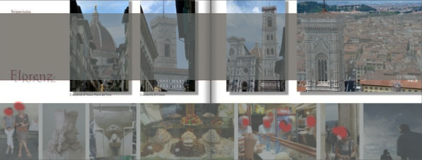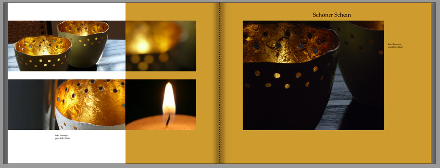 D.h. ich lege mein Gestaltungsraster immer so an, dass ich die aufgeklappte Seite als Ganzes betrachte. Dabei ziehe ich ganz oft Fotos über den Bundsteg hinaus.