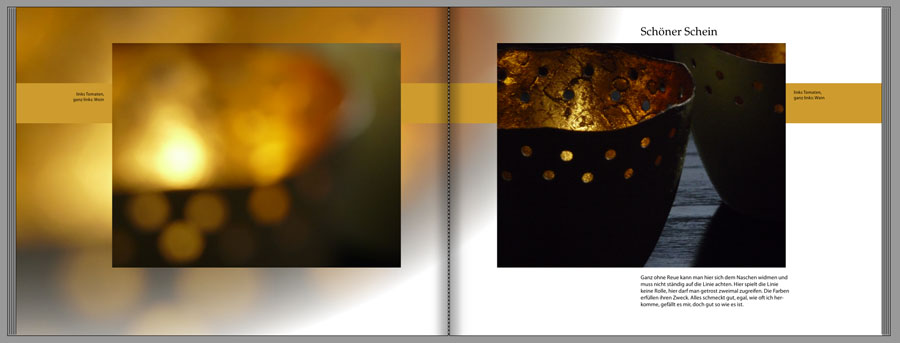 D.h. ich lege mein Gestaltungsraster immer so an, dass ich die aufgeklappte Seite als Ganzes betrachte. Dabei ziehe ich ganz oft Fotos über den Bundsteg hinaus.