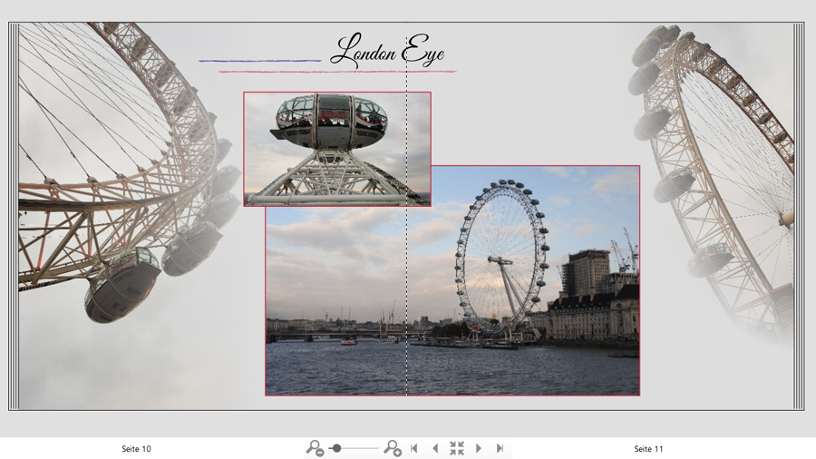 Nici Re: Seite auflockern?Die Seite mit dem London Eye finde ich recht gelungen, die mit dem Hotel weniger. Möchtest du dem wirklich eine Doppelseite widmen? Das Hotel sieht ja von außen recht nett aus. Wenn es die ganze Seite einnimmt, sehe ich keinen Grund es so transparent darzustellen, aber du könntest es von links nach rechts ausblenden lassen. Zimmerfotos, speziell von häßlichen Badezimmer, würde ich aber weglassen. Irgendwie sieh alles eher düster und traurig aus.