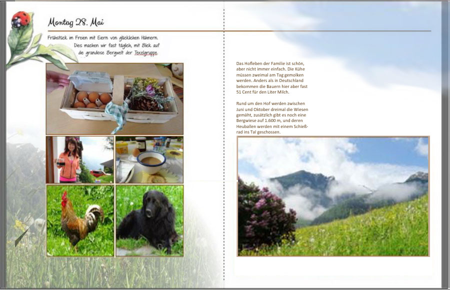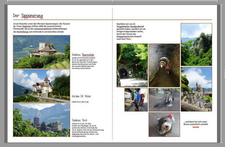 Re: Passeiertal.... wenn du jetzt noch nach Montag ein Komma setzt (auch an allen anderen Wochentagen!)vor der 28 und auf der linken Seite beim mittleren Bild den Zeilenabstand bei Kirche St. Peter erb. .... genauso setzt wie bei den anderen beiden Fotos, dann ist es ziemlich perfekt. Mir gefällt deine Gestaltung mit der neuen langweiligen