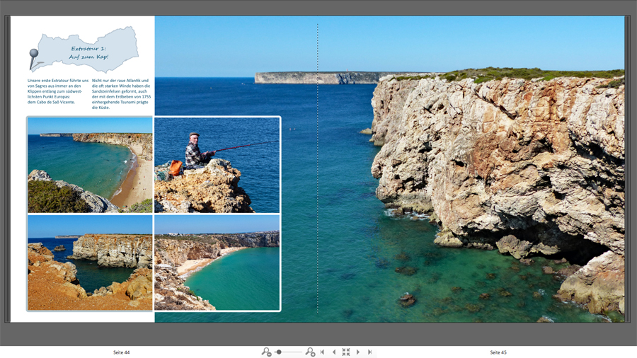 S. Anhang. Bloß die Karte mit Nadel muss ich farblich noch anpassen, ich arbeite oft mit Umrisskarten und färbe die Karten dann entsprechend der auf den Seiten dominierenden Farben ein.Josefia hat geschrieben: Du hast aber grundsätzlich einen guten Blick für die Gestaltung Danke!!!Re: Fotobuch AlgarveReisetante hat geschrieben: Das nehme ich auch gerne bzw. gehe ich oft über die Tastenkombi strg, Alt und Druck, dann habe ich die Bildschirmkopie, kann sie PSE einfügen