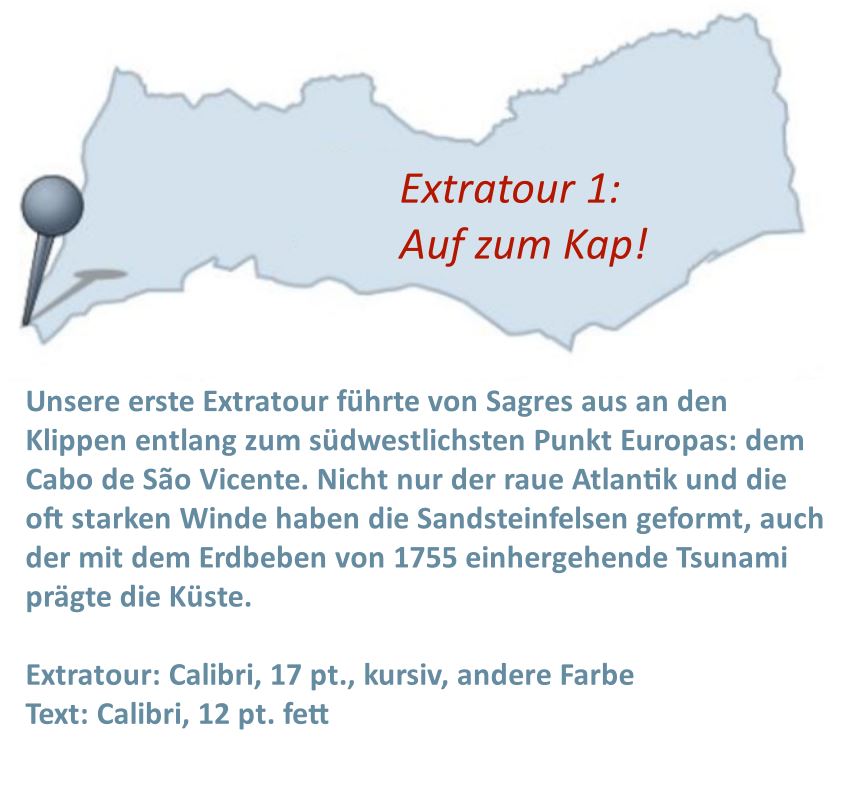 Das wäre auch meine Wahl.Kann es sein, das Du bei Cabo de São Vicente die Tilde falsch gesetzt hast? Man muss nicht unbedingt einen anderen Font für die Überschriften wählen, gerade bei der Calibri sieht es gut aus, dieselbe Schrift zu nehmen und diese fett oder kursiv oder einfach nur größer zu machen. Kann es sein, dass Du den Fließtext in fett geschrieben hast. Das scheint mir bei 12 pt. nicht notwendig. Ich habe gegenübergestellt zwei Versionen probiert: Lieber Gruß, pitty