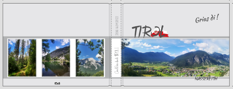 ich verstehe den Zusammenhang der einzelnen Seiten nicht ganz. Du schreibst, dass du für jeden Ort ein einzelnes Buch erstellst, aber die zweite Seite ist doch ein anderer Ort, oder? Beim Cover empfinde ich die Proportionen als nicht stimmig. Den Schriftzug "Tirol" empfinde ich als zu groß, dagegen das untenstehende "Nassereith" als zu winzig. Das schöne Landschaftsbild würde ich größer machen. Ist das Foto unten so abgeschnitten oder kannst du die Ansicht noch etwas nach oben schieben? Anika58 hat geschrieben: Da mein Sommer Buch jetzt fertig ist, bin ich bei der Gestaltung des Nächsten und bitte wieder um Ratschläge und eure Meinung.