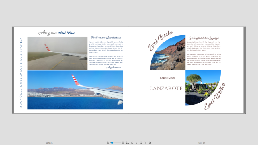 Re: Übergang zwischen zwei Reisezielen gestaltenich habe versucht, Eure Anregungen umzusetzen und bin zufrieden. Lediglich mit der Schriftart bei Mallorca auf dem Cover und dem doppelten L (Schriftart Corbel) kämpfe ich noch. Die Abstände etc muss ich noch anpassen. Der Übergang nach Lanzarote soll für mich so bleiben, auch wenn die beiden Fotos links nicht die hohe Kunst der Fotografie sind. Ich fand es witzig und auch das Wort Angekommen... am Schluss des Textes hat für unsbeiden Zugvögel eine Bedeutung, ist ein running gag... Re: Übergang zwischen zwei Reisezielen gestaltenHallo Kerstin
