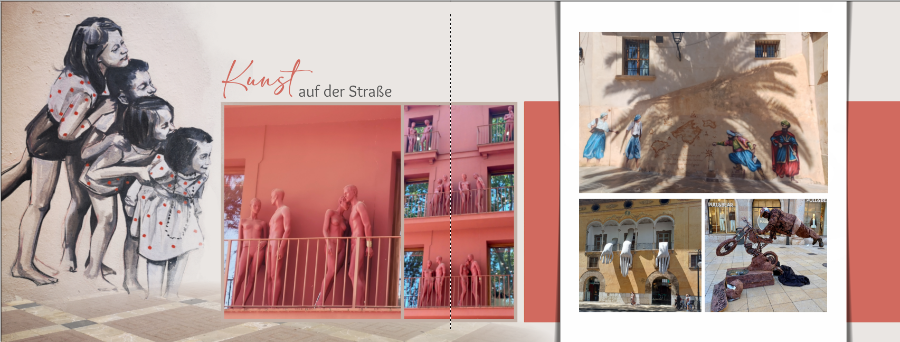 Streetart trifft es m.E nicht, weil damit doch vor allem Graffitis gemeint sind. Ich zeige aber auch anderes. Ob Schaufensterpuppen auf den Balkonen eines Bekleidungsgeschäfts oder der schwebende Motorradfahrer Kunst sind, mag jeder für sich entscheiden.Da das Haus mit den Figuren im Original in Rottönen gestrichen ist, habe ich versucht, das gezoomte Bild farblich anzupassen. Fürchterliche Prozedur spica hat geschrieben: Auf der rechten Seite würde ich auf eines der querformatigen Bilder verzichten. Diese erscheinen mir beide sehr klein und tendieren in meinen Augen damit zu "verzichtbar". Ich würde wohl das Baum/Garten/Draußen-Bild entfernen, da es am wenigsten zur Komposition zu passen scheint.
