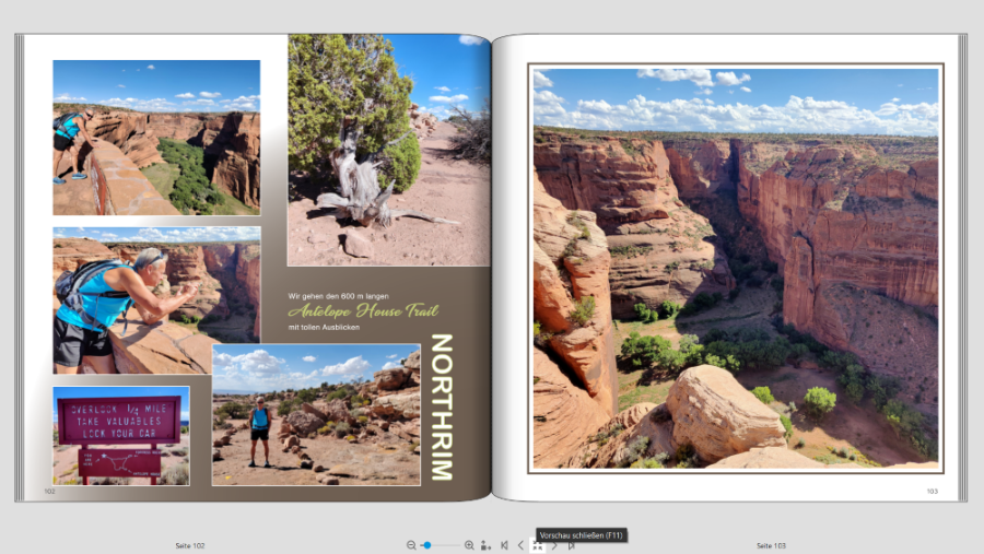 Ich bin mit meinem FB (Teil 1) von unserer Amerika Reise endlich in den letzten Zügen, jetzt kommt mein Mann daher und meint ich sollte doch unbedingt Fotopapier und dadurch Layflat machen. Jetzt hab ich logischerweise die Seiten so gestaltet, dass der Falz berücksichtigt wird. Also teilweise absichtlich mehr Abstand zum Falz. Bevor ich jetzt alles abändere, möchte ich bitte Eure Meinung dazu hören. Ich denke dass ich manche Seiten mit rel geringem Aufwand anpassen kann, aber bei anderen hab ich doch Bedenken dass es irgendwie "komisch" ausschaut. Ich häng Euch mal ein paar Seiten an damit Ihr einen Eindruck von meiner Gestaltung bekommt. jetzt kommen meine Problemseiten wenn ich auf Layflat wechsle Was sagt Ihr dazu? Würdet Ihr wechseln auf Fotopapier. Seitenzahl insgesamt momentan ca 130 Seiten. Das ist jetzt die Hälfte der Reise, Teil 2 fehlt noch komplett VG geniesser66