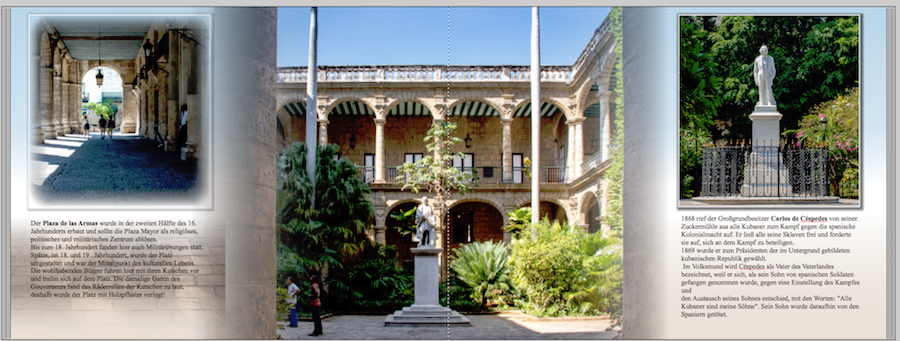 die Bearbeitung hat sich gelohnt! Die Bilder sind angenehm verteilt** und schön, dass die Textblöcke gleich groß sind und auf einer Höhe stehen. Ich habe noch Anregungen zur Typografie: Schrift auf unruhigem Untergrund ist schlecht lesbar. Ich würde daher den linken Block nicht auf die durchscheinenden Pflastersteine setzen. Wenn Du den Zeilenumbruch (s.u.) änderst und die Schriftgröße auf die immer noch gut lesbaren 11 pt verringerst, hast Du Platz, das besondere Holzpflaster ohne Textüberdeckung zu zeigen. Der Zeilenumbruch ist etwas unglücklich: – 16. nicht vom Jahrhundert trennen, – nach ablösen keinen Absatz machen, – u.U. sinnvolle Worttrennungen, um keine zu kurzen Zeilen zu haben (z.B. 5. Zeile linker Block), – Im rechten Block würde ich auf den ersten Absatz verzichten. – Hier hat der zweite Absatz einen unmotivierten Einzug. – nach dem und im rechten Block ist Dir aus Versehen ein Absatz entstanden. Geschmackssache, aber ich würde auch auf das Ausrufezeichen nach dem Wort Holzpflaster verzichten. Das ist auch ohne dieses Satzzeichen eine erstaunliche Befestigung in der damaligen Zeit. **Hast Du eine lay-flat-Bindung gewählt? Ansonsten ist die Statue im mittleren Bild wahrscheinlich im Bund nicht/schlecht zu sehen. Wie wäre es, das linke Bild ohne runde Ecken zu gestalten - so wie das rechte? Lieber Gruß, pitty
