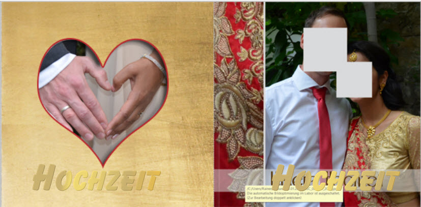 Re: Seiten zur DiskussionAh, jetzt fällt mir noch etwas ein: Ich denke, das Photobuch wird ein 30 x 30 Format? Da kommt das Brustbild des Paares dann eigentlich ziemlich groß raus. Grad am Titelblatt müsste das Photo (und das Paar) dann schon recht makellos sein. Hast du vielleicht ein Ganzkörperbild, das du hier verwenden kannst? Oder vielleicht verkleinerst du das Brustbild, dann entsteht automatisch auch mehr Hintergrund, auf dem man den Schriftzug platzieren kann (goldener Hintergrund, rote Schrift ?).