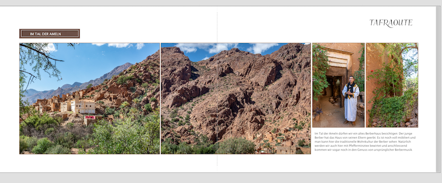 je mehr Seiten Du zeigst, desto mehr überzeugt mich weiß als Hintergrund. Ich würde also definitiv weiß wählen. Auch wenn Du erst später zur Feinarbeit bzgl. Ausrichtung schreitest, fallen mir ein paar Dinge auf: Innerhalb der braunen Textfelder scheint die Ausrichtung derzeit nicht mittig, aber irgendwie gewollt unregelmäßig(?). Das verwirrt mich als Betrachter. Hier fände ich mittig schöner. Die Überschrift TAFRAOUTE spricht mich persönlich mehr an, als die braunen Kästchen. Ohne braun hinterlegtes Textfeld fände ich die Seiten noch schöner als jetzt schon. Dem Esel auf der dritten Seite würde ich ein bisschen von seinem Weg wegnehmen, sodass der Text höher rücken und unten mit den Bildkanten abschließen kann. Auf der gleichen Doppelseite würde ich auch das Überschriftsfeld nach links rücken, analog zu den anderen gezeigten Seiten. An seiner jetzigen Position auf der rechten Seite wirkt es auf mich irgendwie verloren... Ansonsten bleibe ich dabei: Ganz zauberhaftes Buch! Ich finde es schade, nicht drin blättern zu können. Liebe Grüße