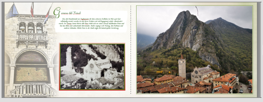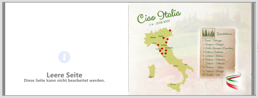 Hallo Anika, L.G. Anika das nenne ich mal Vorarbeit. Schon vor der Reise mit dem Fotobuch beginnen. Würde ich wahrscheinlich nie schaffen. Das Cover gefällt mir sehr gut. Eine Kleinigkeit für die 1. Seite. Die Landkarte von Italien ist mir zu nahe an der Beschreibung. Vielleicht kannst Du da noch einen etwas größeren Abstand lassen. Landkarte eine Idee nach links oder Beschreibung nach rechts. Die Skizze unten rechts würde ich persönlich nicht verwenden. Die Mohnblume hat mir da viel besser gefallen. Muss ja nicht ganz so groß sein. Weiterhin viel Spass beim Gestalten und eine schöne Reise. Liebe Grüße Asiafan