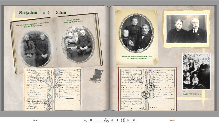 Das ist natürlich sehr subjektiv gesehen. Es geht hier vor allem um sehr persönliche Dokumente aus der Familie meiner Mutter, denen ich einen eigenen Platz einräumen möchte. Alternativ müssten es 2 Fotobücher werden. Allerdings möchte ich gerne beide Familien in einem Band haben und und trotzdem jeder Familie einen gebührenden Platz einräumen. Inzwischen überlege ich, ob ich statt "Karl und Minna Chronik" auf einen Coverseite der Titel "Chronik der Familie O... " und auf der anderen "Chronik der Familie B..." setze. Wenn man dann das Buch in der Hand hat, kann man sich überlegen, bei welcher Familie man anfangen will zu gucken.Re: Ist das eine gute Idee?Traumfänger hat geschrieben: Inzwischen überlege ich, ob ich statt "Karl und Minna Chronik" auf einen Coverseite der Titel "Chronik der Familie O... " und auf der anderen "Chronik der Familie B..." setze.