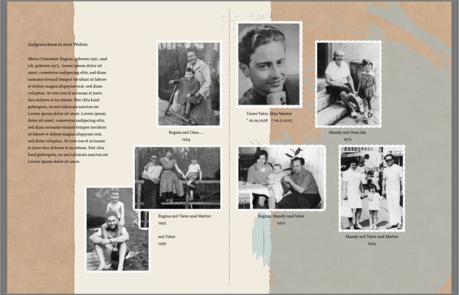 Deine neue Gestaltung mit zwei Fotos von deinem Vater ist auch eine gute Idee. Die Aufteilung der Bilder, besonders der unteren Bilderreihe finde ich noch ein bisschen ungünstig. Das linke Foto ist so weit abseits. Vielleicht kannst du das Ganze nochmal etwas hin- und herrücken, bis es mehr aus einem Guss ist.