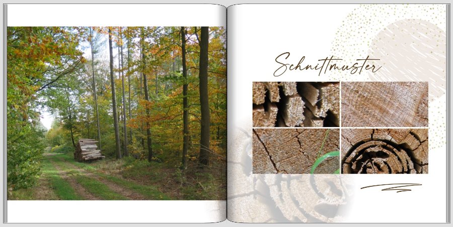 Re: Wandertagebuch HeidschnuckenwegIch würde bei den Schnittmotiven bewusst keine runde Bildgestaltung wählen, da die Muster meinem Empfinden nach so eher an Spannung verlieren. Auch sind Deine gezeigten Schnitte doch recht ähnlich in der Anordnung. Eher würde ich die Schnittflächen mit unterschiedlichem Zoom und unterschiedlichen Ausschnitten zeigen, die neugierig machen, wie es weiter geht, ohne es zu zeigen. Mit ein paar runden teiltransparenten Cliparts und/oder Fotos im Hintergrund könnte man das Ganze aufpeppen und die Seite auffüllen. In meinem Fundus befindet sich genau ein Holzstapel und ein Baumschnitt