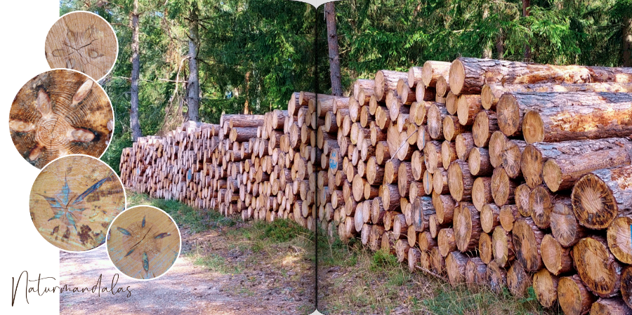 Aus dem Holzstapel habe ich einige Baumstämme mit faszinierenden Mustern fotografiert, die ich dem Bild in seiner Gesamtheit gegenüberstellen möchte. Da es runde Baumstämme sind, habe ich eine runde Gestaltung gewählt und den Holzstapel als Strichzeichnung dahinter gelegt. So wirklich sagt mir die Gestaltung aber nicht zu, habt ihr dazu irgendeine Idee? Lieber Gruß Traumfänger