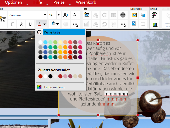 Wenn du beispielsweise ein "Hindernis" umschreiben möchtest, oder die Zeilen etwas nach links oder rechts verschieben möchtest, kannst du Buchstaben (ich benutze gerne m's für größere Abstände und i's für die kleineren, wie es halt gerade passt) einfügen und die dann farblos machen. Dadurch verschiebt sich der sichtbare Teil weiter an den Rand und du der Text geht nicht über das Bild drüber.