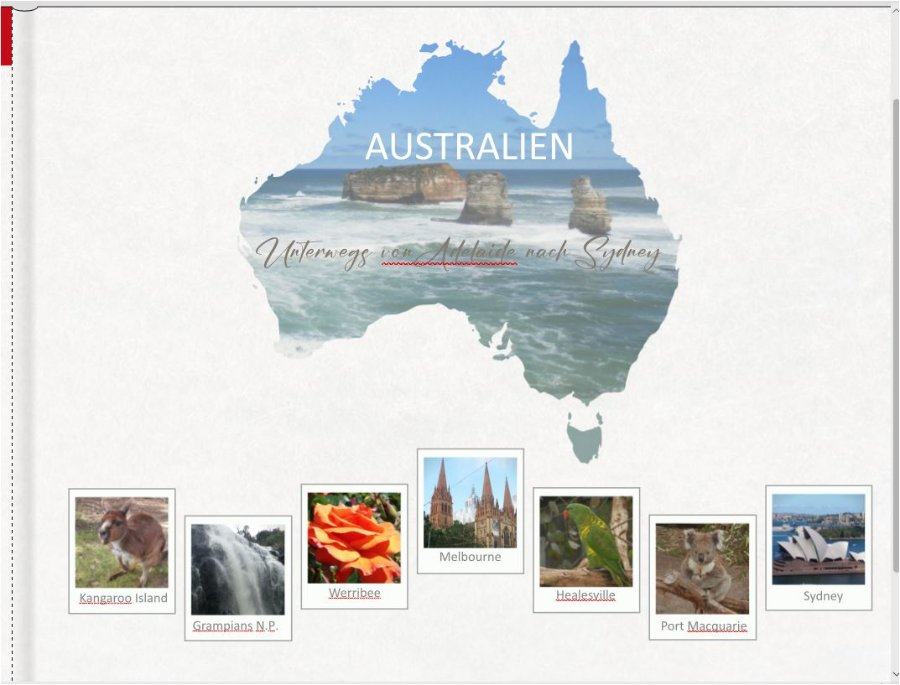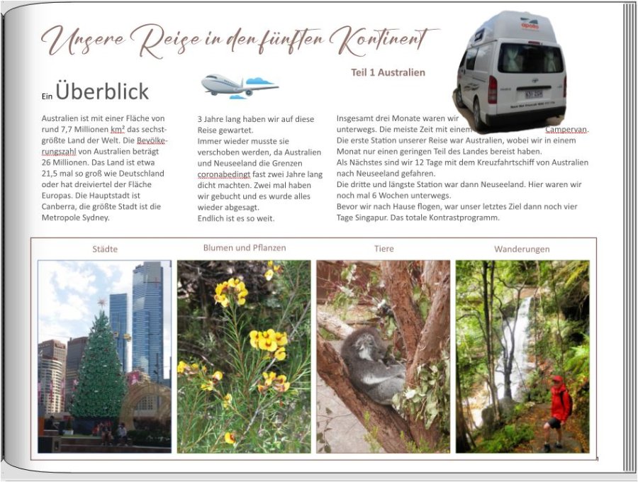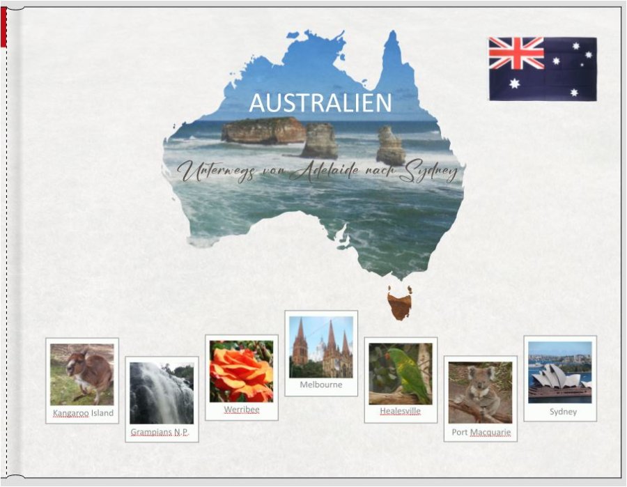 Danke Spica, Und wenn Du magst, zupf nochmal an den Bildunterschriften. Sydney und Werribee sitzen nicht mittig. Veröffentlichst Du eigentlich? Ich bin mega neugierig. Und wo ging die Kreuzfahrt lang, die Du separat gestaltest? irgendwie war mir die erste Variante jetzt doch zu fad. Deshalb hab ich es noch mit dem Foto probiert. Bei der Schriftfarbe bin ich auch hängen geblieben. Ich kann ja das Foto noch etwas transparenter machen. Jetzt wo ich fast fertig bin, habe ich erst gesehen, dass es eine Maske von Australien gibt. Ja, die Bildunterschriften zupf ich noch etwas. Leih mir doch mal deine Augen. Ich muss dies immer so groß ziehen. Wenn dies so weitergeht, wird es bald keine FB von mir mehr geben. Ich werde das Fotobuch wieder veröffentlichen. Unsere Kreuzfahrt ging von Sydney über Eden, Tasmanien und Melbourne nach Neuseeland. Hier noch einige Sounds und noch mal 5 Häfen angefahren bis wir in Auckland von Port gegangen sind. Deshalb werde ich von Sydney nur ein bis zwei Seiten in dieses Fotobuch packen. @Isabel, ich finde es super, wenn mehrere User hier Ratschläge geben. Danke für Deine Meinung. Das Foto zeigt die zwölf Apostel. Das Hightlight der Gread Ocean Road. Es war aber gar nicht so einfach für die Maske ein Foto zu finden, weil teilweise zuviel abgeschnitten wurde oder es im oberen Bereich nicht passte. Die Oper von Sydney ist für das zweite Fotobuch mit der Kreuzfahrt angedacht. Liebe Grüße Asiafan