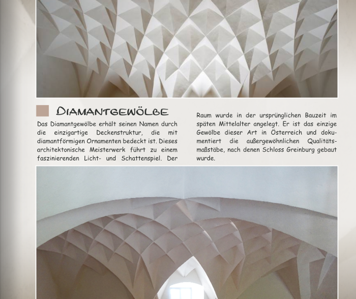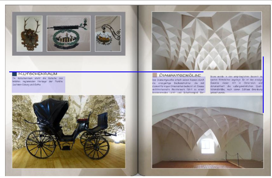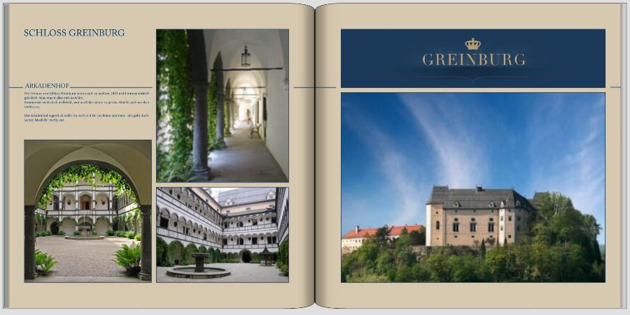 Re: Schloss Greinburg - wie gestalten?pitty hat geschrieben: Noch ein kleiner Vorschlag: Die Textblöcke Kutschenraum und Diamantgewölbe würde ich auf die selbe Höhe bringen. Hallo pitty, die Textblöcke sind in gleicher Höhe bei der Überschrift, würdest du die unteren Zeilen angleichen und zwischen Überschrift und Textanfang Leerzeilen setzen? pitty hat geschrieben: Viel wesentlicher ist aber, dass wir fast überall mit querformatigen Bildern konfrontiert werden (Landschaft, Fernseh- und Computerbildschirme, Kinoleinwand...). Diese Eindrücke in Hochkantbüchern zu präsentieren ist tatsächlich schwierig.