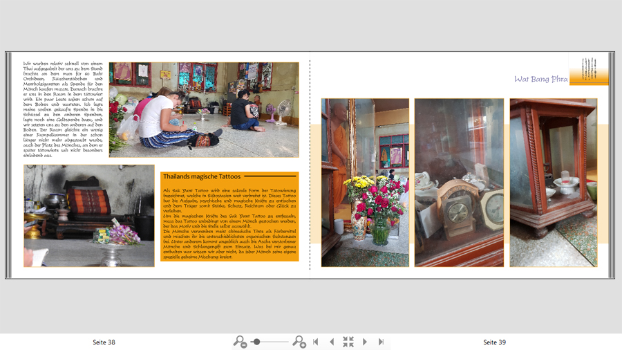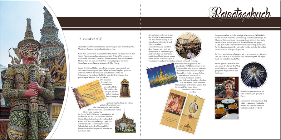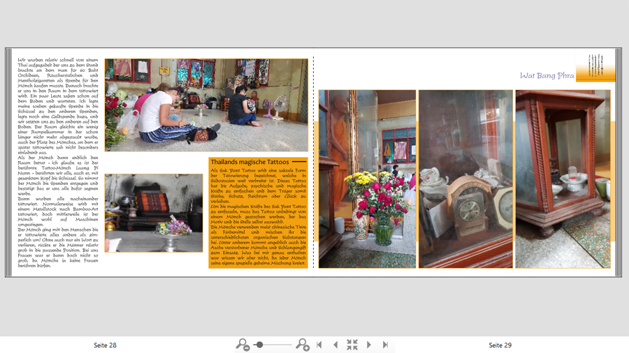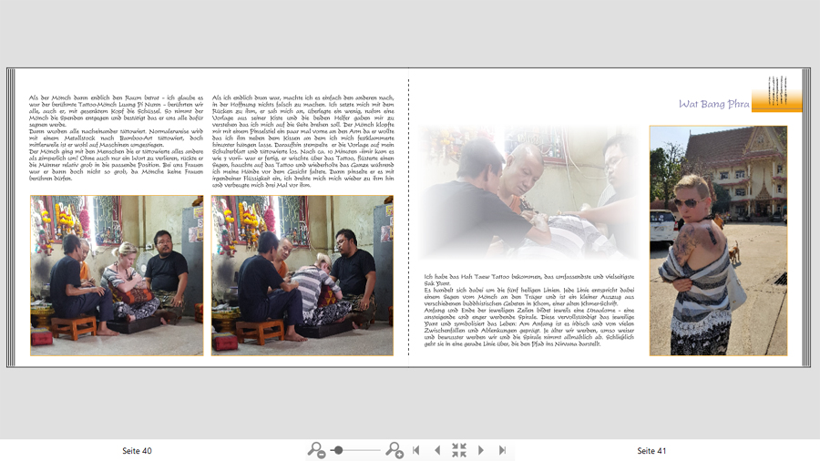 Liebe Nici, könntest du vielleicht bei deinem Profil das Bundesland angeben? Wir hatten schon ein paar Forentreffen in Wien und ich bin immer neugierig wo ihr alle lebt. --------------------------------------------------- Re: Unstimmige Seite - Thailand FB hat geschrieben: Da ich mich ausgiebig mit diesem Layout beschäftigt habe, möchte ich dir auch zeigen, wie ich Seiten mit viel Text gestaltet habe. Offensichtlich ist dir das Erlebnis im Wat Bang Phra ja sehr wichtig (hast du dir ein Tattoo stechen lassen?). Also gib ihm Raum! Es ist dein Buch und darin präsentierst du deine Erinnerungen. Weiche nicht ab vom anderen Layout, setzt die Fotos mit Abstand zueinander und platziere den Text großzügig. Wie schon pitty und Rotuma geschrieben haben: geh nicht so nah an den Rand, denn irgendwie sehen deine Seiten überfüllt aus. Und wenn es dann am Ende drei Seiten sind, ist das doch auch in Ordnung.