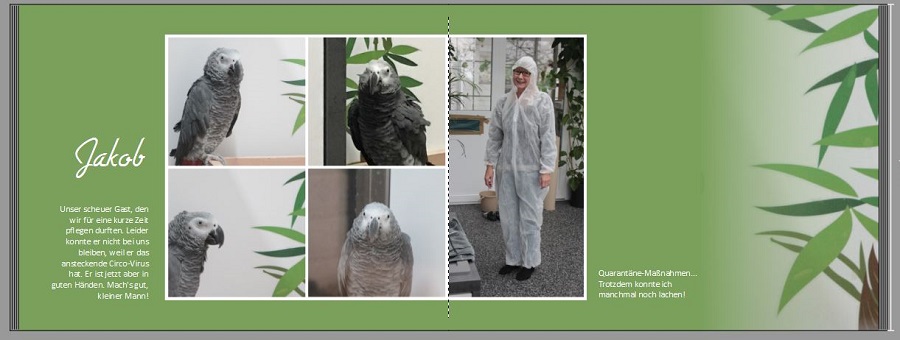 Wir laden Sie herzlich ein, die neue CEWE Community mit integriertem Forum zu entdecken und künftig zu nutzen. Das bisherige Forum, in dem Sie sich gerade befinden, steht nur noch bis Ende 2025 für neue Beiträge zur Verfügung und wird ab dem kommenden Jahr 2026 nur noch lesend zugänglich sein. Informieren und registrieren Sie sich jetzt in der neuen CEWE Community – wir freuen uns auf Sie! Tierseite gestaltenLiebe Forenmitglieder, ich stelle euch mal eine Seite zur Begutachtung vor, bei der ich nicht so recht weiterkomme. Dazu möchte ich euch eine kleine Geschichte erzählen. Für unsere beiden weiblichen Graupapageien suchten wir zwei Männchen. Aus dem Tierschutz bekamen wir den Jakob vermittelt. Er war bei uns für ein paar Wochen in Quarantäne und wir mussten ihn leider weitergeben, weil er eine ansteckende Viruserkrankung hat. Trotzdem haben wir ihn sehr lieb gewonnen und der Abschied tat uns ziemlich weh. Mit den neuen Haltern sind wir in Kontakt und es geht ihm gut dort. Leider habe ich nur sehr wenige Fotos von ihm, z. b. die zwei Handyfotos, auf der linken Seite, die kleinen. Ich möchte aber die kurze Zeit mit ihm für immer festhalten. Was meint ihr zu dieser Doppelseite?