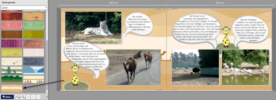 eine tolle Idee ist das. Deine Texte gefallen mir gut. Ich frage mich nun, willst du wirklich einen Comic gestalten oder hast du einfach diese von dir gewählte Form so genannt? Ein richtiges Comicformat wäre natürlich auch klasse. Das ist ja schon von den anderen beschrieben worden. Ich würde dann die Protagonisten im Bild sprechen (oder denken) lassen und dem kleinen "Klugscheißer" Wenn du das bisherige Format beibehalten willst, schau doch mal bei den CEWE-Hintergründen "Länder". Dort gibt es gezeichnete Landschaften, die für deine Gestaltung passen könnten. Ich habe ein paar ausprobiert und finde, das geht ganz gut. Ein großer Teil des Hintergrundmotivs wird dabei abgedeckt, so dass es nicht wirklich zu erkennen ist. Es wirkt dann einfach farbig. Ich kann im Moment keine Sortierung bei den Fotos erkennen. Du könntest dann vielleicht je nach Hintergrundthema die passenden Tiere auf eine Seite sortieren oder, wenn das nicht machbar ist, auf den Doppelseiten farblich passende Fotos mit einen entsprechenden Hintergrund kombinieren. Nur damit du weißt, welche Hintergründe ich meine, hier mal ein Screenshot. Farblich passt das so natürlich nicht, aber das bekomme ich mit deinem Screenshot nicht passend hin und die Zeit reicht grad nicht, um die Seite ganz nachzubauen liebe Grüße