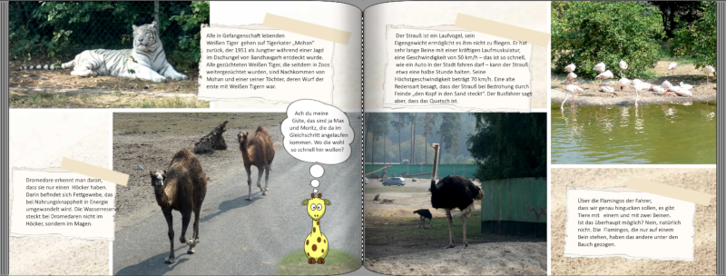 super Idee! Aber wie Pitty schrieb, sollte es Bild an Bild mit Rahmen gestaltet werden. Dann bekommt es den typischen Comic Look. Bei großen Formaten, siehe Nashörner, kann der Erzähler plus Sprechblase ruhig mit ins Bild. Bei kleineren Formaten könntest Du jeweils kleine "Comic-Bildchen", in denen der "Erzähler" agiert, daneben setzen. Aber alles seitenfüllend und mit Rahmen versehen. Schön wäre eine Figur in verschiedenen Positionen/Ausführungen. Dann sieht das nicht immer gleich aus, sollte der "Erzähler" zweimal auf einer Seite (Doppelseit) auftauchen. Du könntest den "Erzähler" nicht nur sprechen lassen, sondern auch mit Comic-typischen Denkblasen gestalten. Siehe Dromedare:" Ach du meine Güte, sind das Max und Moritz, die da im Gleichschritt angelaufen kommen?" Den Erklärtext dazu kannst Du dann in einer separaten Box unterbringen. Viele Grüße Re: Tierpark-ComicMir fällt dazu noch ein, dass ich das Buch auf jeden Fall bunt und fröhlich machen würde, auch mit vielen Comic-Zeichen, eins hast du ja auch schon drin. Und dein kleines Männlein finde ich als running gag richtig süß, das würde ich drin lassen und vielleicht mit den Tieren Dialoge führen lassen.