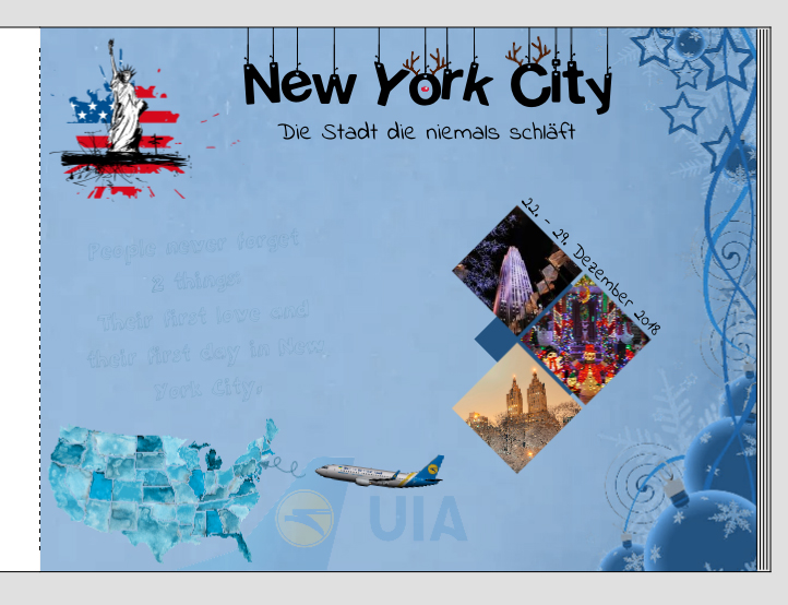 Guten Morgen nic.h,bei nachvollziehbaren Gründen spricht nichts gegen viele Schriftarten. Aber lesen sollte man den Text schon. Ich kann jedenfalls überhaupt nichts von dem erkennen, was da in Blau auf blauem Hintergrund steht. Und habe mit New York ganz andere Assoziationen und finde die gewählten Schriftarten zu lieb und daher unpassend. Ich frage mich, warum Du eine Fluggesellschaft bewirbst. Da Du cliparts nehmen möchtest, wäre das eine Gelegenheit. Mein Bauchgefühl eckt mit den Rhomben an, die Gestaltung wirkt auf mich zusammenhanglos. Lieber Gruß, pitty