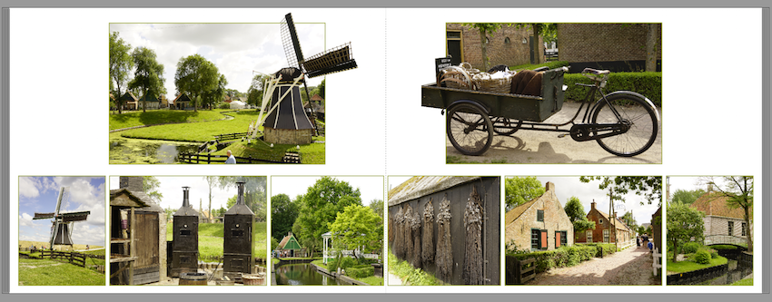 Mir geht es wie dsl-schnell. Das Layout ist gut und benötigt m.E. keine weiteren clipart- oder Hintergrundergänzungen. Das würde nur von der Freistellung ablenken.Einen Text habe ich dazu noch nicht. Ich weiß auch noch nicht genau was ich dazu schreiben soll. Ich würde leichte Veränderungen am Gestaltungsraster ausprobieren, aber nur, wenn es zum Rest des Buchs passt: (Ich gehe davon aus, dass Du eine Layflat-Bindung ausgewählt hast.) Das könnte mit mehr Luft nach oben funktionieren, dann werden die oberen Fotos etwas kleiner und/oder Du schiebst sie nach unten, so dass derselbe Abstand entsteht wie bei den anderen Fotos. Die Ränder außen würde ich vergrößern, was wiederum zu Lasten der Fotogröße oder -formate ginge. Also im VH etwa so: unten 2 Teile, außen 3 Teile, oben 4-5 Teile. Die Doppelseite verträgt auf jeden Fall etwas Text. Es können Bildunterschriften sein. Wie heißt der Ort, wie die Mühle, was ist das für ein Lastenfahrrad, was zeigen die beiden Öfen, welcher Fluss, welche Gracht ist das usw. Oder persönliche Gedanken wie "Endlich Pause", "Hier möchte ich bleiben", "hier läuft die Zeit rückwärts" usw. Lieber Gruß, pitty
