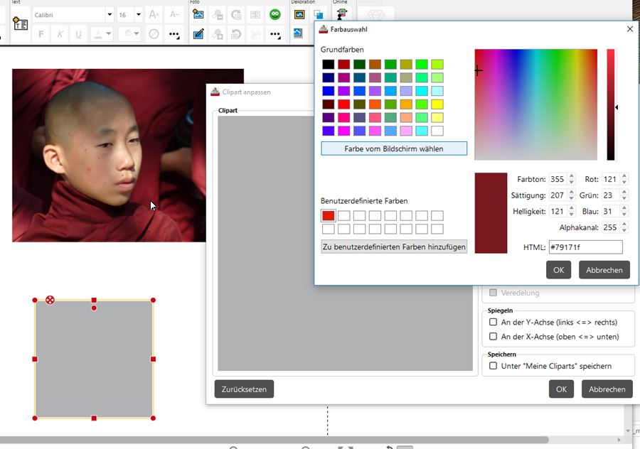 ich sehe es ein wenig wie DSL-schnell: Band 3 sollte vom Stil her zu den beiden anderen Bänden passen. Nichtsdestotrotz gefällt mir Pittys Vorschlag einer schlichten Gestaltung in Mönchs-Rot. Dazu habe ich diesen Layoutvorschlag, wobei das Bild noch in eine runde, statt in eine ovale Form gebracht werden müsste. Wenn Du keinen passenden Farbton bei den Hintergründen findest, wie Du schreibst, dann kannst Du einfach ein farbiges Clipart umfärben und dann in Seitengröße als Hintergrund einfügen. Das funktioniert so: Cliparts auswählen, Kategorie Farben wählen, beliebige Farbe wählen und auf die Seite ziehen Farbquadrat doppelt anklicken, Feld "Jetzt" doppelt anklicken, anschließend "Farbe vom Bildschirm wählen" und mit dem Cursor Farbe aus der Mönchskutte picken. Dann mit ok bestätigen -> Quadrat ist umgefärbt Quadrat über die ganze Einzel- oder Doppelseite ziehen und abschließend mit ALT und - in die letzte Ebene schieben. Um Blitzer zu vermeiden, sollte das Clipart ein gutes Stück über die Seitenkanten gezogen werden. Liebe Grüße