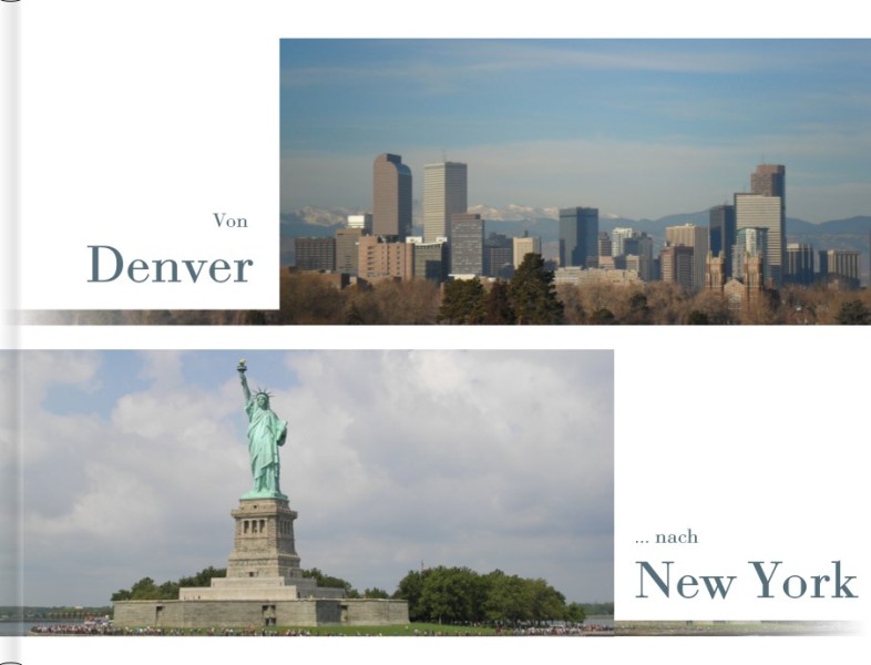 Deine beiden ersten USA-Bücher haben mir wirklich gut gefallen, besonders auch die Cover. Wenn Du es diesmal ganz anders gestalten willst, wird es nicht einfach, auf das Niveau zu kommen, fürchte ich. Grundsätzlich bin ich bei Dir, der Entwurf für das Cover spricht mich nicht an, da fehlt noch die zündende Idee. Ich habe überlegt, warum, und da ist mir aufgefallen, dass er wie ein Inhaltsverzeichnis wirkt. Da fehlen nur noch die Ortsnamen und die Reisedaten, dann wäre der Schmutztitel schon fast fertig. Die 4 Bilder müssen ja auch recht schmal sein, bei Panorama Groß höchstens 5 cm, bei Panorama XXL vielleicht 7 - 8 cm. Welches Format hast Du denn gewählt? Ich meine, es wäre wahrscheinlich besser, wenn Du auf dem Cover ein oder höchstens 2 Bilder verwendest, diesen dann aber mehr Raum gibst. Bei dem Titel "Von Denver nach New York" würden sich ja 2 Bilder dieser Städte anbieten. Ich habe mal etwas rumprobiert, mit Bildern aus meinem Fundus, in welche Richtung es gehen könnte. Die Schrift ist Bodoni, sie kann auch veredelt werden. Wenn Du ein Foto von Miss Liberty nehmen willst, achte darauf, dass sie nicht "wegschaut", also seitlich raus, sondern entweder den Betrachter ansieht oder die Nachbarbilder. Das wirkt harmonischer. Zu den Fonts: Für mich ist da weniger mehr. Wenn ich richtig gezählt habe, hast Du mind. 6 verschiedene Schriften verwendet. Für Hervorhebungen im Fließtext würde ich keinen anderen Font nehmen, sondern den gleichen Font farbig und/oder fett, evtl. auch grösser verwenden. Gibt es einen Grund, auf dem Schmutztitel wieder eine andere Schrift einzusetzen? In Deinen anderen USA-Bücher hast Du Dich auch auf wenige Schriften beschränkt und das wirkt sehr gut. Sicherlich, das ist alles auch eine Geschmacksfrage, und schliesslich muss es Euch gefallen. Viele Grüsse