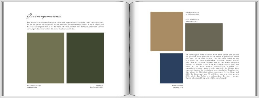 voorab, die Hintergrundfarbe des Covers gefällt mir persönlich nicht besonders, der Farbton ist einfach nicht mein Geschmack, wahrscheinlich würde ich, wenn schon nicht weiß, irgendeinen gant hellblauen Ton wählen, evtl. auch nur als breiten Farblock senkrecht über eine halbe Seite, damit etwas Spannung in die Gestaltung kommt. Die Idee mit den Farbklecksen auf den Seiten finde ich gar nicht schlecht, aber ich würde sie viel größer ziehen, damit sie in ihrer Form gar nicht mehr so zu erkennen sind und mehr vom Hintergrund verdecken. Vor allem aber würde ich sie viel transparenter machen. Für die Museumsseite hätte ich den Vorschlag,die Bilder erstmal exakt an den Außenkanten der Rahmen zu beschneiden. Die beiden linken Bilder würde ich exakt nebeneinander setzen, nicht höhenversetzt, die drei Bilder auf der rechten Seite so, daß das obere auf einer Linie mit der Oberkante der linken Seite übereinstimmt. Farbkleckse würde ich auf dieser Seite auch nicht verwenden, das war schon die richtige Intuition, aber vielleicht könntest du mit einemfarbigen Blockstreifen etwas Spannung auf die Seite bringen. Auf der vorletzten Doppelseite wäre mir das transparente Schwarzweiß-Foto zu groß.Es wirkt gleichberechtigt zu dem Bild daneben, isttt es aber nicht wirklich wegen der S/W Transparenz. Ich würde es ohne Rand, sondern mit einer Verlaufsmaske bündig in die rechte Ecke setzen und das Bild daneben etwas überlappen lassen. Das fällt mir erstmal spontan dazu ein. Zum Basteln ist es jetzt zu spät, aber vielleicht kannst du ja aufgrund meiner Beschreibung nachempfinden, wie ich es meine. Gute Nacht! LG Bäuerin