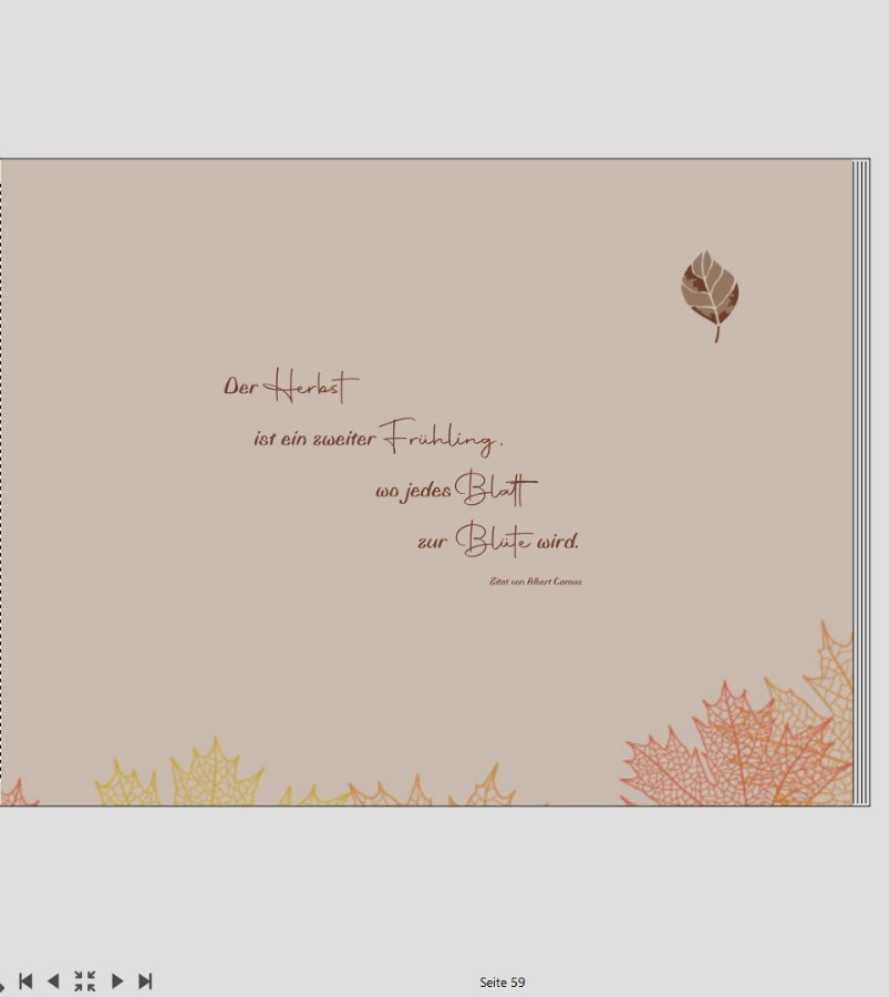 Re: Seite nur mit Zitat gestaltenMir geht es wie spica, die Seite mit den Hunden passt farblich nicht zu der Zitatseite. Auch ist für mich nicht erkennbar, was die Bilder mit dem herbstlichen Zitat zu tun haben. Ich würde eher versuchen, ein zu den Bildern passendes Zitat über Hunde zu finden.