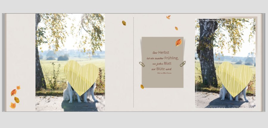 Beim Anschauen Deiner Seite und dem Lesen der verschiedenen Vorschläge stolpere ich darüber, dass eine farbenfrohe, herbstliche und inhaltliche Gestaltung der Textseite nicht so recht zu den Fotos der linken Seite passt. Deine Hunde sitzen vor einem hellen, grünen, sonnigen Bereich. Da würde ich spontan keinen Herbst assoziieren. Eine knallig bunt gestaltete Textseite passt dann zwar ganz toll zum Inhalt des Textes, aber nicht zu den dazu platzierten Fotos. D.h. ich würde einen anderen Text und auch nur ein Foto aus der ähnlichen Situation wählen. Und falls die Hunde bei den Aufnahmen erkennbar unterschiedlich schauen, vielleicht bei der zweiten Aufnahme einen deutlichen Zoom nutzen, sodass sich beide Bilder unterscheiden.