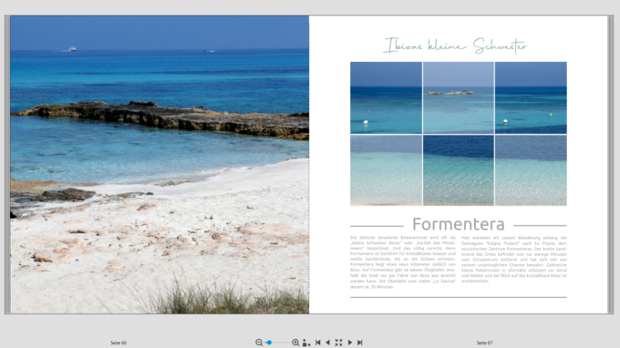 die Seite sieht sowohl vom Design als auch von der Farbharmonie sehr schön aus. Der in zwei Spalten aufgeteilte Text gefällt mir gut. Aber auch hier finde ich die Bildauswahl etwas langweilig. Das heißt, für den Kapiteleinstieg Formentera würde ich ebenfalls verschiedene Bilder auswählen, um die Neugier auf das Nachfolgende zu wecken. Lieber Gruß Traumfänger Re: Neues Buch - Ibiza - Entscheidungshilfe gefragtIch finde Kunigundes Vorschlag auch recht schön.