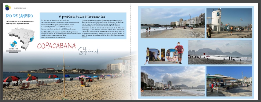 deine Brasilien-Übersichtsseite gefällt mir sehr gut. Die Seite mit den angepinnten Fotos gefällt mir ebenfalls. Was die rechte Seite betrifft, so schließe ich mich meinen Vorschreiberinnen an, sie mir auch zu unruhig und unübersichtlich. Vor allem fällt mir ins Auge, dass die Schrift nicht besonders gut lesbar ist. Ob die Bilder noch notwendig sind oder ob sich hier Bilder von der linken Seite wiederholen, ist auf dem Laptop nicht gut zu erkennen, d.h. ich würde sie weglassen, wenn es sich um "Zweitfotos" handelt, ansonsten würde ich sie vermutlich auch auf die gleiche Größe bringen. Möglich wäre auch auf der Seite ganz links eine zusammenhängende Bilderspalte, wo du dann Seitenzahlen aus dem Inhaltsverzeichnis in die Fotos setzt. Inspirationen findest du in diesem Buch. Die Copacabana-Seite finde ich zwar sehr ansprechend, allerdings sehe ich auf dieser Doppelseite 4 Bilder vom Strand, 3 davon zeigen einen sehr ähnlichen Anblick. Meine Frage: Brauchst du wirklich so viele gleichartige Bilder, um deine Erinnerungen wachzuhalten? Wäre es nicht viel schöner, nur 1 oder 2 Bilder zu verwenden und diesen deutlich mehr Platz zu geben? Ich weiß, dass eine solche Entscheidung immer sehr schwer fällt, ich selber habe auch immer damit zu kämpfen. Aber hinterher bin ich meistens sehr froh über weniger, aber dafür größere Bilder. isabel2104 hat geschrieben: Oh ich she gerade das mit dem markierten Text zum antworten krieg ich nicht hin. Bin zu doof dafür.