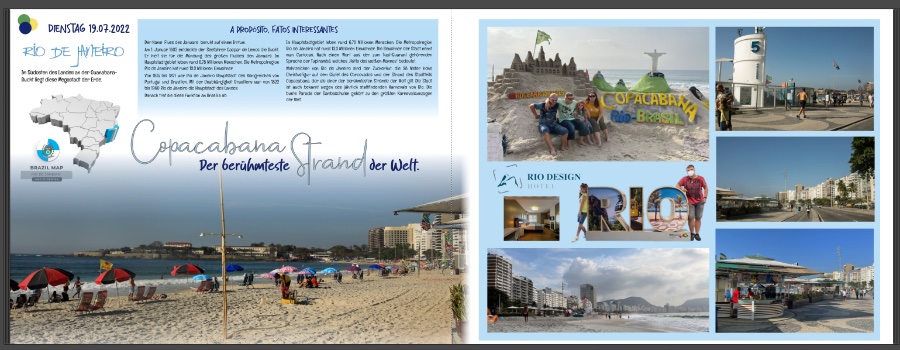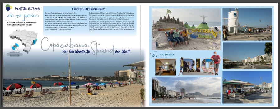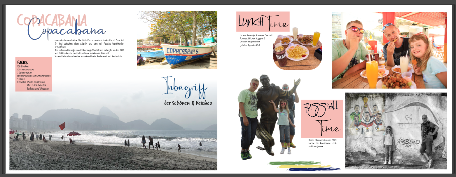 Falls Du noch etwas zupfen willst: Ich würde die Reisedaten auf der linken Seite des Inhaltsverzeichnisses in der Schrift schreiben, die Du in der Zeile darüber genutzt hast. Rat Infested Mailbox finde ich für Zahlen nichts so schön, weil auch nicht so gut lesbar. Copacabana-Strand-Seite rechts: Hast Du hier schon probiert, das kleine Hotelfoto so groß zu ziehen, dass die obere Kante eine Linie mit der oberen Kante von RIO bildet? Und dann den Hotelslogan über das Bild zu stempeln? 2. Copacabana-Seite: Hier würde ich keine verschiedenen Schriften für LUNCH Time etc. verwenden. Auch finde ich den Wechsel deutsch/englisch bei FUSSBALL Time komisch. Wie wäre es an dieser Stelle mit der Schrift, die Du hier auf der linken Seite für Copacabana (rosa) verwendet hast? Und dann halt Soccer Time oder Fußballzeit. Liebe Grüße