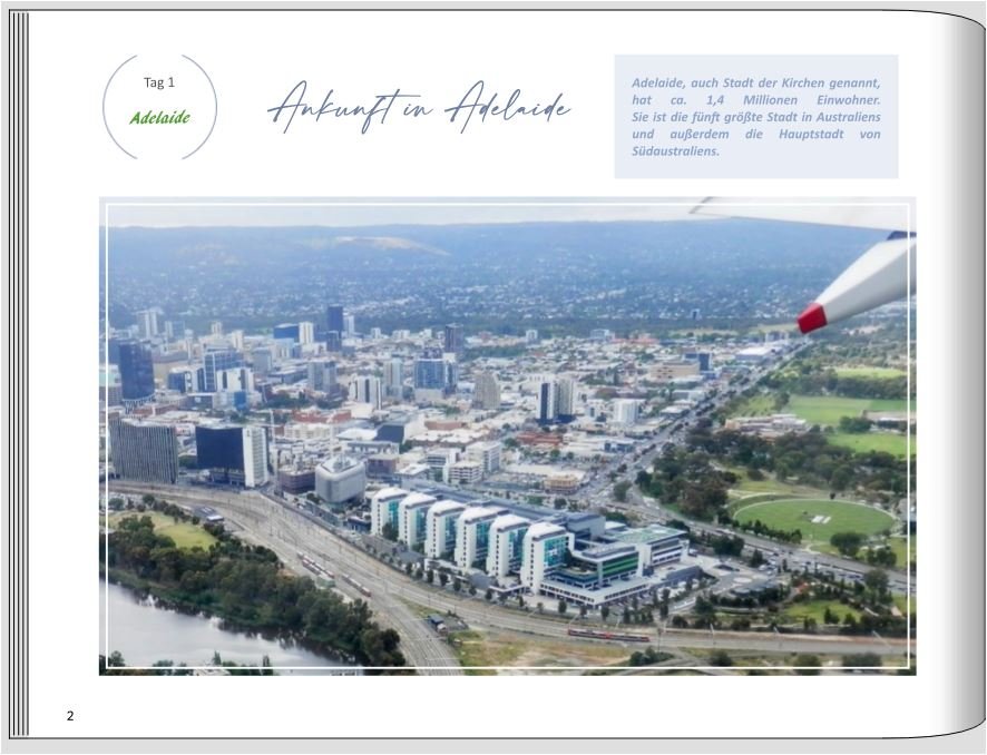 Urlaubsfan Re: Loyout Fotobuch AustralienIch habe jetzt mal etwas umgestellt. Was haltet ihr von dieser Version? @Reisetante es war verregnet. Leider habe ich von Adelaide nicht sehr viele Fotos. Das Foto der Landung habe ich ziemlich bearbeitet. Das Foto gefällt mir noch nicht so gut, weil es oben so schräg ist, ansonsten wäre das Flugzeug nicht mehr zu sehen. Da bin ich noch am suchen nach einem geeigneten Foto. Vielleicht zoom ich ein Detail heraus. Liebe Grüße Asiafan