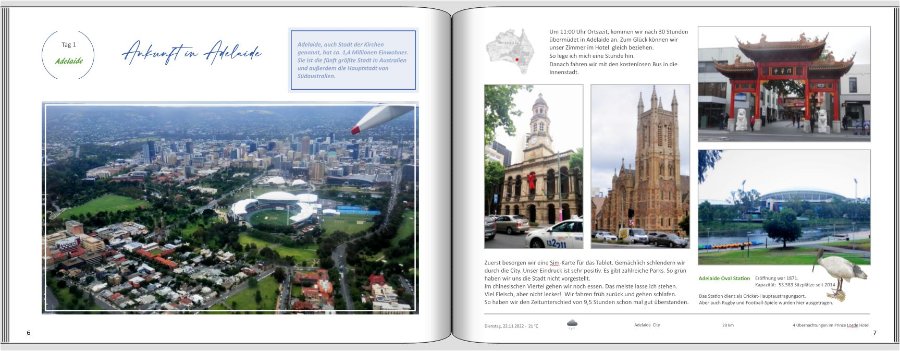 dein überarbeiteter Vorschlag gefällt mir besser. Allerdings finde ich das große Adelaide-Bild "schief", vermutlich, weil das Flugzeug eine Kurve geflogen hat. kannst du das begradigen? Und muss unbedingt ein Teil des Fliegers auf dem Foto drauf sein? Mir gefällt Spicas Idee, die "Tagesdaten" rechts anzuordnen und mittels Linie zu trennen, denke aber, dass das beim Querformat nicht so gut wirken würde. Wenn Du ganz auf die Kreis verzichtest und den Australien-Kontinent nur als Kontinent-Form und Tag 1 nur als Text bringst? Oder Du integrierst tag 1 in den Kontinent, müsstest diesen dann aber ggf etwas größer machen. Re: Loyout Fotobuch AustralienHallo zusammen,