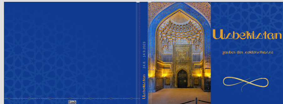 Mit meinem neuen Projekt bin ich so auf Halbzeit. Genug, um sich ein paar Gedanken zu machen, ob es passt oder nicht. Irgendwie hänge ich grad wieder fest. Selbst ist man ja nun schon soweit im Buch, dass es nicht schadet, wenn mal ein paar neutrale Augen auf das Werk schauen. Mein Stil soll nach wie vor eher klar bleiben, das Land (Usbekistan) gibt aber schon etwas mehr her. Ich habe nun extern einen Hintergrund gefunden, der zum Baustil passt. Ist das zu dominant? Ich habe immer mal wieder Verlaufsmasken drauf gelegt. Die Farben des Landes sind alle Blau-Töre und viel Gold, je nach Region aber auch Lehm. Was will ich ausdrücken? Die Schönheit des Landes und der Gebäude. Aber natürlich auch unsere persönlichen Erlebnisse. Die Textfelder sind unterchiedlich, ob Bericht oder Information. Die Infos will ich wieder als Blocksatz machen, das mache ich aber erst, wenn die Gestaltung steht. Auf einer Seite habe ich mal probiert, ob goldenen Farbränder oder auch Farbfelder evtl. gefälliger sind als das Blau, hab da etwas ausprobiert. Ich bin gespannt, ob ich durch euch wieder in die Spur komme. LG und schon mal vielen Dank Monika