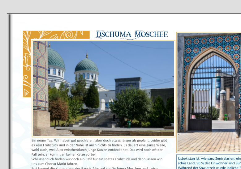 Mit meinem neuen Projekt bin ich so auf Halbzeit. Genug, um sich ein paar Gedanken zu machen, ob es passt oder nicht. Irgendwie hänge ich grad wieder fest. Selbst ist man ja nun schon soweit im Buch, dass es nicht schadet, wenn mal ein paar neutrale Augen auf das Werk schauen. Mein Stil soll nach wie vor eher klar bleiben, das Land (Usbekistan) gibt aber schon etwas mehr her. Ich habe nun extern einen Hintergrund gefunden, der zum Baustil passt. Ist das zu dominant? Ich habe immer mal wieder Verlaufsmasken drauf gelegt. Die Farben des Landes sind alle Blau-Töre und viel Gold, je nach Region aber auch Lehm. Was will ich ausdrücken? Die Schönheit des Landes und der Gebäude. Aber natürlich auch unsere persönlichen Erlebnisse. Die Textfelder sind unterchiedlich, ob Bericht oder Information. Die Infos will ich wieder als Blocksatz machen, das mache ich aber erst, wenn die Gestaltung steht. Auf einer Seite habe ich mal probiert, ob goldenen Farbränder oder auch Farbfelder evtl. gefälliger sind als das Blau, hab da etwas ausprobiert. Ich bin gespannt, ob ich durch euch wieder in die Spur komme. LG und schon mal vielen Dank Monika