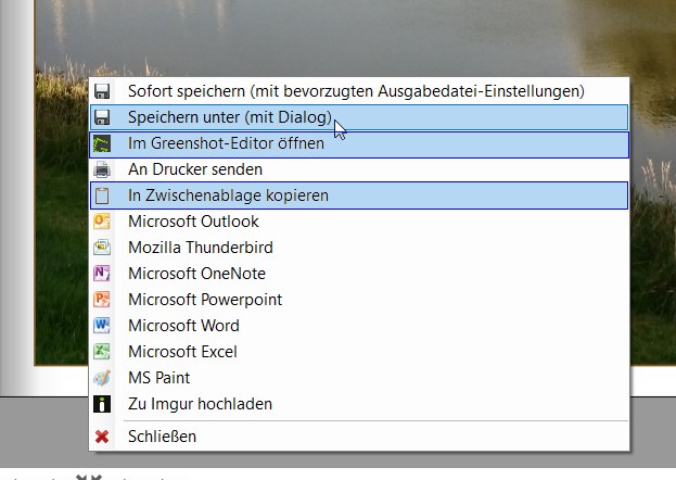 Außerdem kann man das Ziel des Screenshots einstellen. Ich habe dort "Ziel dynamisch auswählen" aktiviert, so dass ich bei jedem Shot wählen kann, welche Aktion folgen soll. Will ich das Vorschau-Fenster der FB-Anwendung komplett abfotografieren, drücke ich Strg+Druck. Dann öffnet sich der Ziel-Dialog und ich kann auswählen, ob ich den Screenshot direkt speichern oder im Editor bearbeiten will. Manchmal kopiere ich auch in die Zwischenablage, um z.B. in gimp weiter zu arbeiten. Klasse ist auch "Fenster aus Liste abfotografieren", wenn man z.B. nur ein Dialog-Feld abfotografieren will. Dafür muss man Greenshot aus der Task-/Benachrichtigungsleiste aktivieren. liebe Grüße