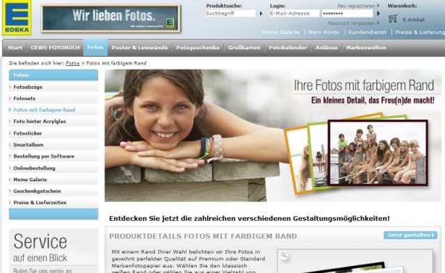 Hallo Josefia,kommt es dir darauf an, Bilder mit Rand online bestellen zu können? Falls auch die Bestellung per CD in Frage kommt, empfehle ich, dafür die ungebrandete (generische) Version der CEWE Fotowelt zu verwenden. Damit kann man auch Fotos mit Rand (übrigens stehen viele verschiedene Farben zur Auswahl) bestellen. Die gebrannte Bestell-CD kann man bekanntlich bei jedem beliebigen CEWE-Vertragshändler abgeben, also auch bei DM ! Es ist ja auch kein Problem, die ungebrandete CEWE-Fotowelt parallel zu einer Handelspartnerversion auf dem PC zu installieren. Außerdem glaube ich, dass man Fotos mit der Software der meisten Handelspartner auch online bestellen kann. DM ist da wohl eher die Ausnahme (wahrscheinlich, weil sie noch eine eigene Fotoproduktpalette anbieten). Darüber kann man sich auf der jeweiligen homepage sehr schnell informieren (Beeispiel Edeka): Re: Kann man Fotos bei promarkt abholen?Danke okular,