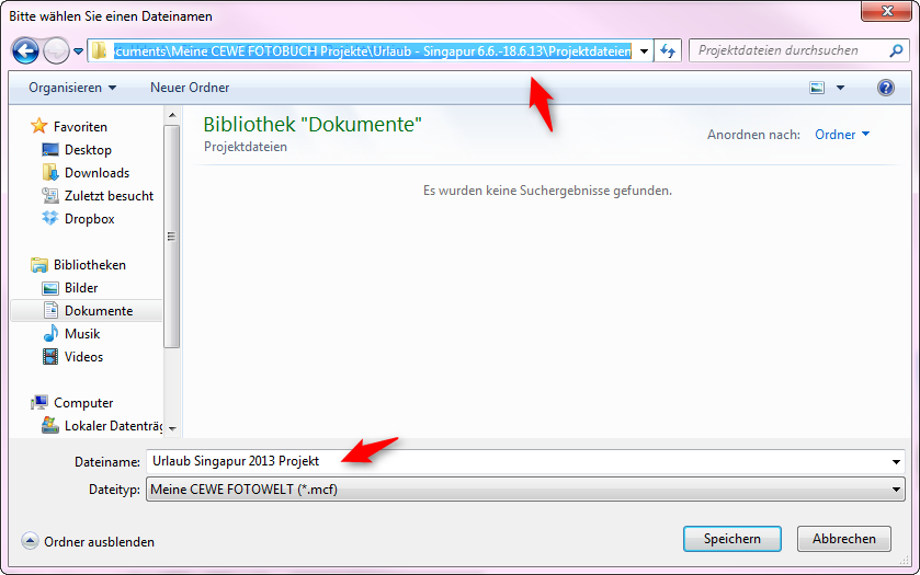 4. Wenn Sie Ihre Ordner soweit vorbereitet haben, können Sie Ihr neues CEWE FOTOBUCH beginnen oder Ihr bereits begonnenes Projekt in dem neu angelegten Verzeichnis abspeichern.