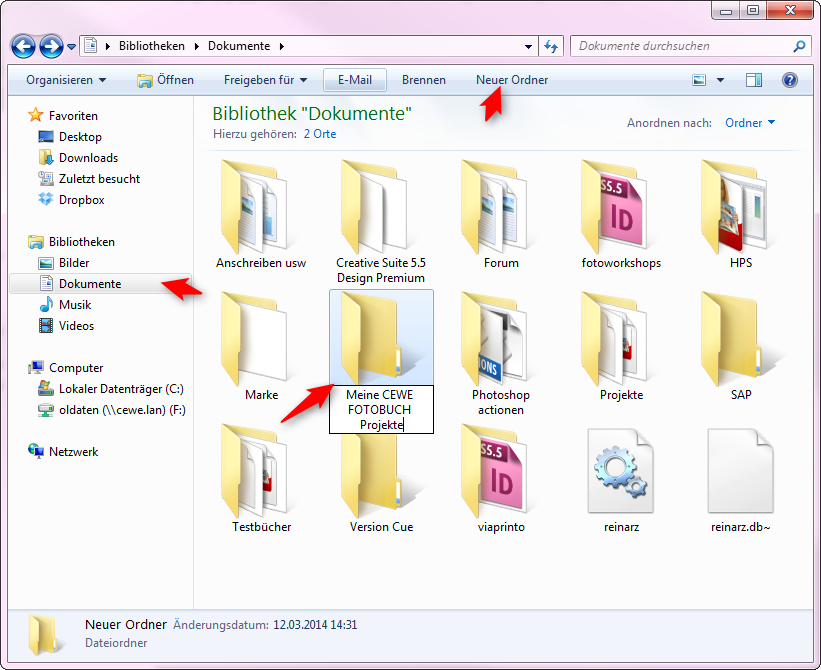 1. Richten Sie einen Ordner in Ihrem persönlichen Bereich wie „Eigene Dokumente“ oder „Eigene Bilder“ ein, dem Sie einen themenübergreifenden Namen geben, wie z.B. Meine CEWE FOTOBUCH Projekte.