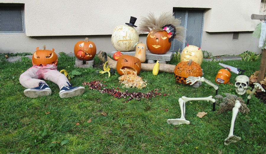 Re: Challenge 10/2017 • Süßes oder Saures!Dieses Grusel-Kürbis-Kabinett habe ich in einem Vorgarten in unserer Wohnanlage entdeckt