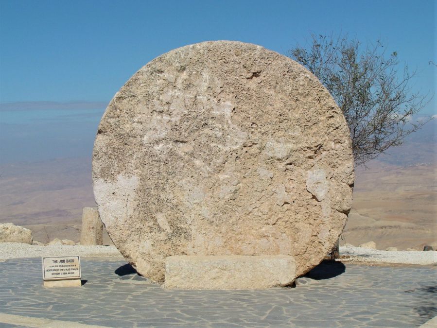 Re: Challenge 01/2020 • Eine runde Sache!Der Rollstein Abu Badd, der einst zur Befestigung des Tors eines byzantinischen Klosters diente, befindet sich heute hinter der Moseskirche auf dem Berg Nebo (Jordanien)